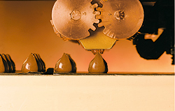 ・守り続ける独自の製法 カファレルのジャンドゥーヤは、モルド(型)を使わずに成型する、独特の製法で作られています。かつては製菓職人によって手作業で作られていましたが、1968年、その技術を再現できる機械を開発。以来、50年近くにわたって、レシピも変わりなく、厚くビロードのようななめらかな食感のジャンドゥーヤを作り続けています。 |